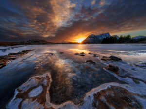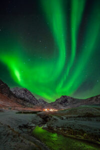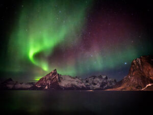 Am 30. Jänner stand ein Quartierwechsel an: vom idyllischen Hamnøy ins bereits deutlich „urbanere“ Leknes. Dort bezogen wir eine Unterkunft in einer kleinen Bucht südlich des berühmten Strandes von Haukland. Besonders die Strände Vik, Haukland und Uttakleiv hinterließen einen bleibenden Eindruck. Gestärkt durch die legendären Zimtschnecken des Sjokoladerommet-Cafés gelangen uns auch hier nächtliche Aufnahmen einer dramatischen Aurora Borealis.